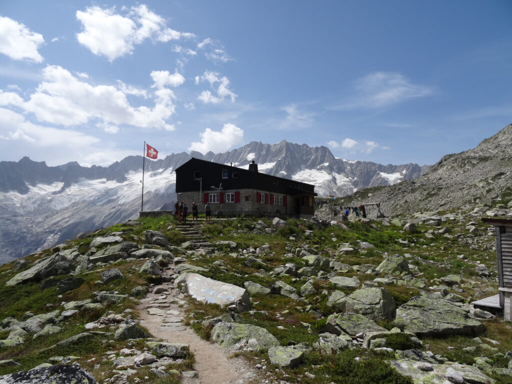 Am 14. August waren endlich alle Exen, Kletterfinken und Müsliriegel eingepackt und es konnte losgehen. Motiviert um 5 Uhr am Pendlerparkplatz getroffen, kamen wir schon gegen Mittag in Göschenen an und konnten nach einem relativ sportlichen Aufstieg die schöne Aussicht von der Bergseehütte aus genießen. Direkt am gleichen Tag haben wir die technischen Details einer Mehrseillänge am Übungsfelsen aufgefrischt, damit am folgenden Tag die ersten längeren Touren geklettert werden konnten. Das typisch deftige Schweizer Abendessen in Kombination mit Kartenspielen und dem ausführlichen Studium der Topos machte die Vorbereitung perfekt!