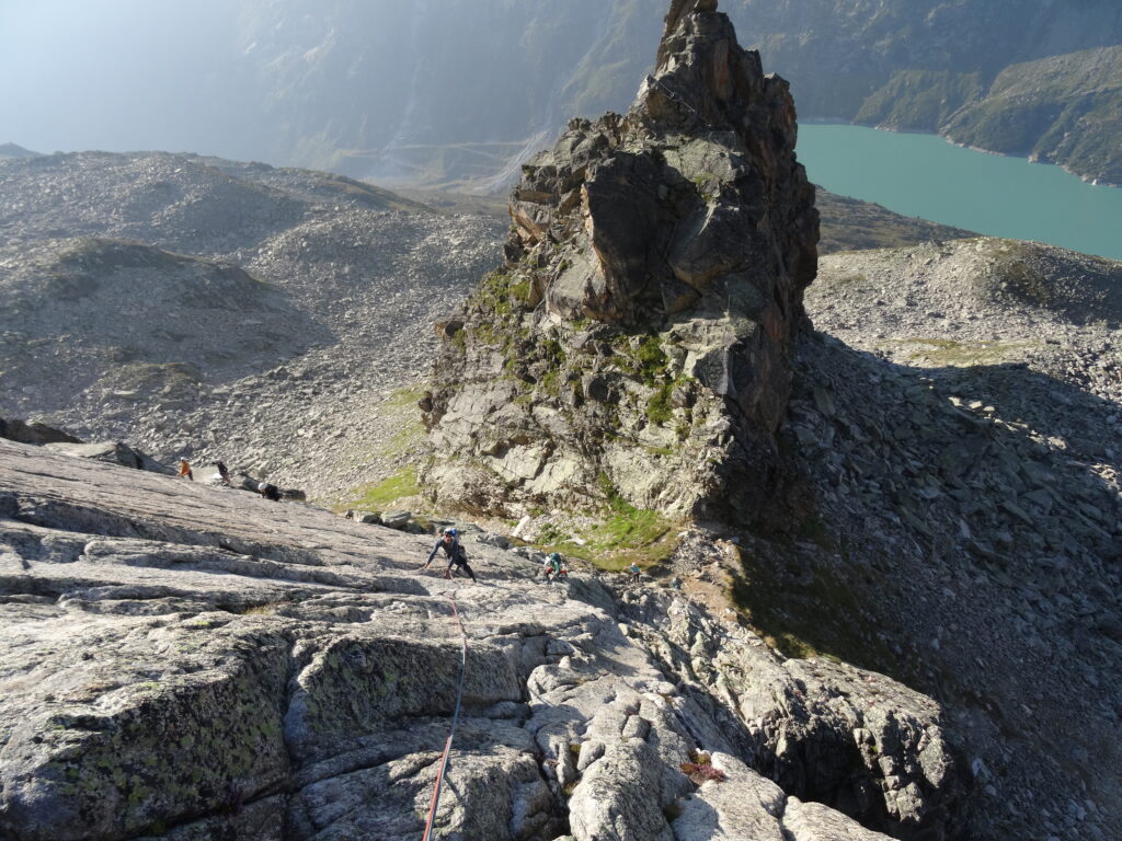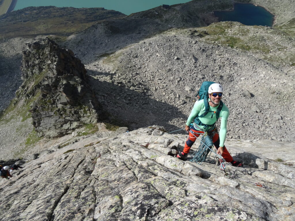 Aufgestanden bei Sonnenaufgang, konnten wir dann die ersten Mehrseillängen klettern. Mit der Sonne im Rücken machte die technisch anspruchsvolle Plattenkletterei an griffigem Granit besonders viel Spaß und wir konnten einige Seillängen abhaken. Statt einer Dusche wartete danach der kühle Bergsee auf uns!