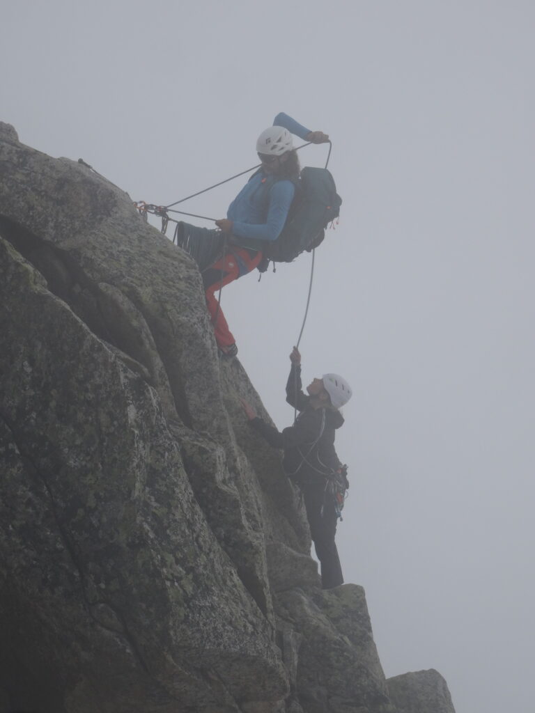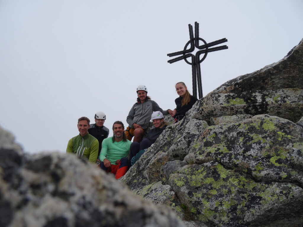 Gleich am nächsten Tag stand die Kür unserer Reise an: die Besteigung des 2819 Meter hohen Bergseeschijen! Ganze 10 Seillängen und 450 Höhenmeter kletterten wir in ca. 5 Stunden und ließen uns selbst von der – für eine Plaisirroute – ziemlich alpinen Absicherung nicht aufhalten. Für mich persönlich war das wirklich eine besondere Erfahrung, die mich auch mental ziemlich herausgefordert hat. Gemäß dem Motto „Wenn du keine Angst hast, machst du was falsch“ (Zitat Ben) machte ich unserem Verein alle Ehre und legte meinen ersten Friend. Wir kletterten in tiefe Nebelschwaden hinein, passierten Gratpassagen und verließen uns auf den ein oder anderen nichtexistenten Tritt. Trotz aller Anstrengungen zauberte uns das Erreichen des Gipfelkreuzes ein echtes Lächeln ins Gesicht. Auch das Gipfelbuch bestätigt: Wir haben es geschafft!